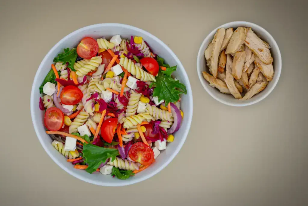 Classic Chicken Bowl – Marineret pasta, kylling, salatmix, salatost, majs, rødløg, agurk, cherrytomater, syltet rødkål, granatæblebalsamico